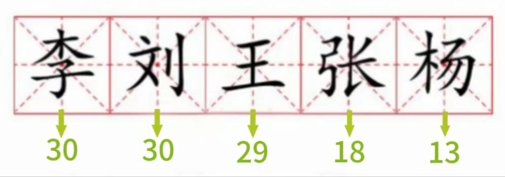 分别是“李”、“刘”、“王”、“张”、“杨”