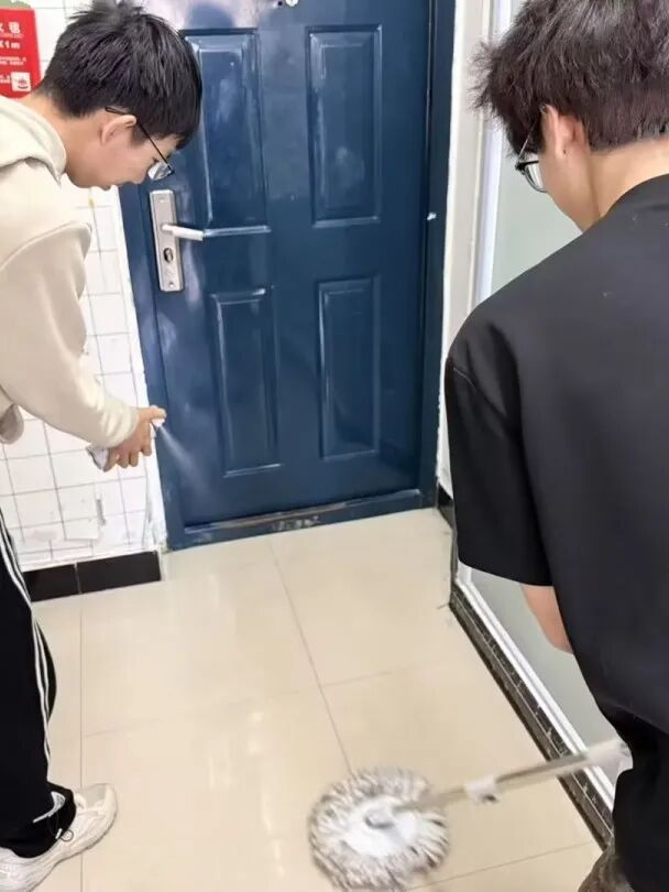 活动中,同学们分工协作,有序开展清洁工作,对宿舍卫生间高频接触区域进行全面擦拭;用消毒喷雾对门把手、储物柜等重点部位进行消杀;同步做好宿舍公共区域地面的清洁与擦拭。从门窗扶手到墙角缝隙,同学们细致覆盖每一个卫生死角,以实际行动筑牢校园健康“防护网”。